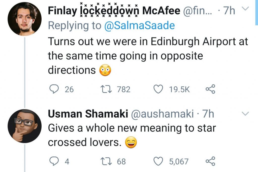 Finlay replied to her tweet, writing: “Turns out we were in Edinburgh Airport at the same time going in opposite directions.”