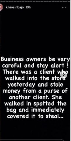 Kiki Osinbajo went on to share the video of a woman who pretended to be a buyer and stole N50k from another client who was buying items from her shop.