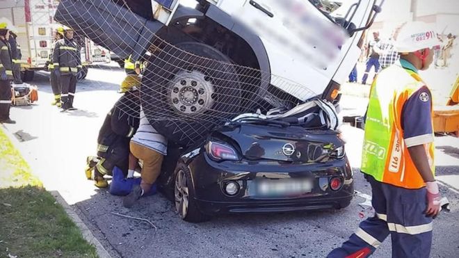A 26-year-old woman is being treated for serious injuries after a lorry landed on top of a car in the coastal town of Port Elizabeth.