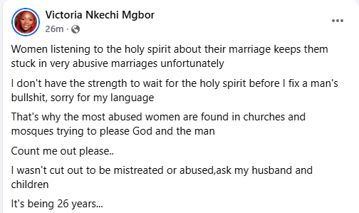 A Nigerian woman, Victoria Nkechi Mgbor, who has been married for 26 years said that women are stuck in abusive marriages because they listen to the teachings of the Holy Spirit on marriage.