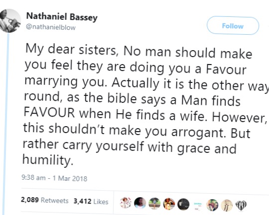 Gospel artist has dished out powerful advice to young ladies, who feels men are doing them favor by marrying them, in a Post on Twitter Nathaniel Bassy said its rather the other way round..