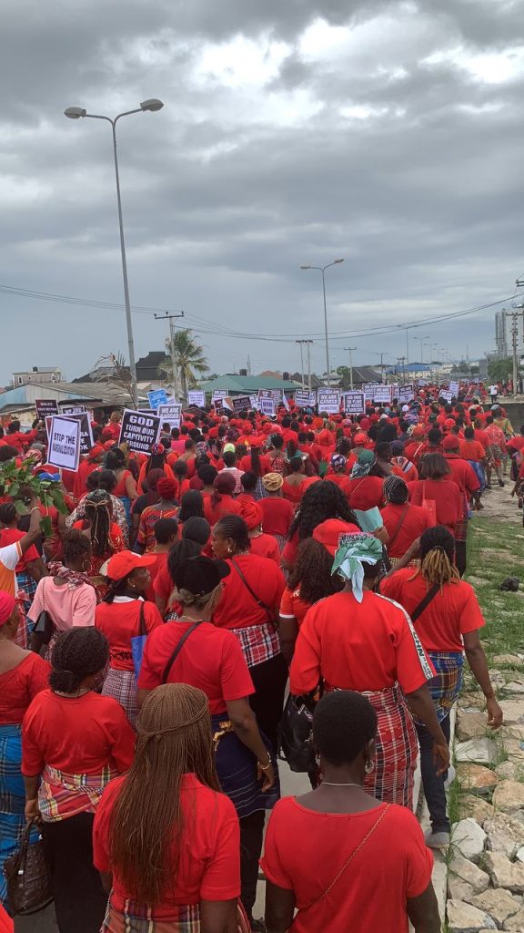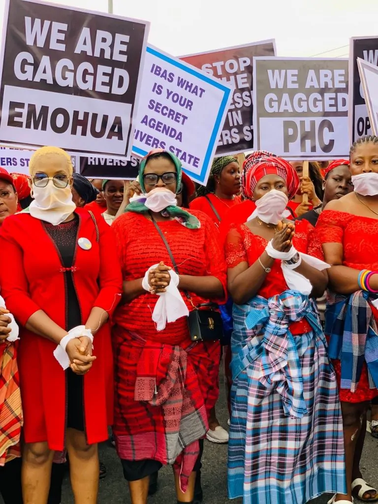 The protesters wore red attires and held placards bearing inscriptions like ‘We have conscience’, Bring Back Governor Fubara’, ‘We are gagged’, ‘Rivers state economy suffers under Ibas’, ‘NBA have conscience’, among others.