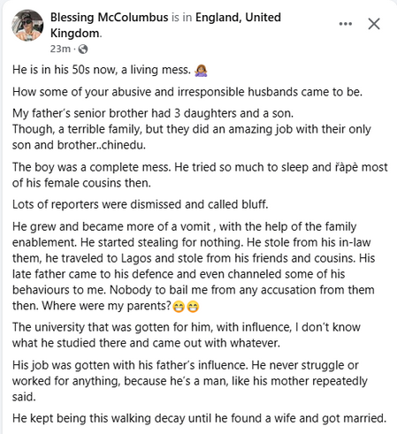 She claimed her cousin, Chinedu, turned into a complete living mess with the help of his mother and family enablement.