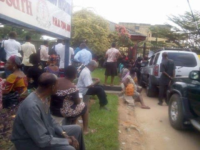 Aggrieved workers at the Abia State University Teaching Hospital, today embarked on a warning strike following 7 months salaries owed them by the management of the hospital. The workers are seen above staging a protest in front of the hospital.