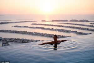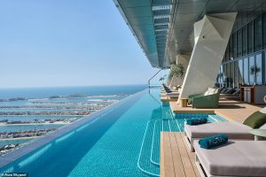 ‘The Aura Skypool’ in Dubai is the world’s first 360-degree infinity pool and is set a whopping 200m (656ft) above the ground on the 50th floor of the 52-storey Palm Tower on Palm Jumeirah island.