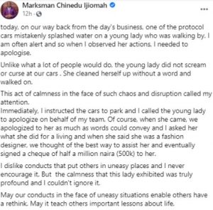 The businessman, Marksman Chinedu Ijiomah, who shared the story on Facebook, said he was driving when one of the cars on his entourage splashed water on the lady.