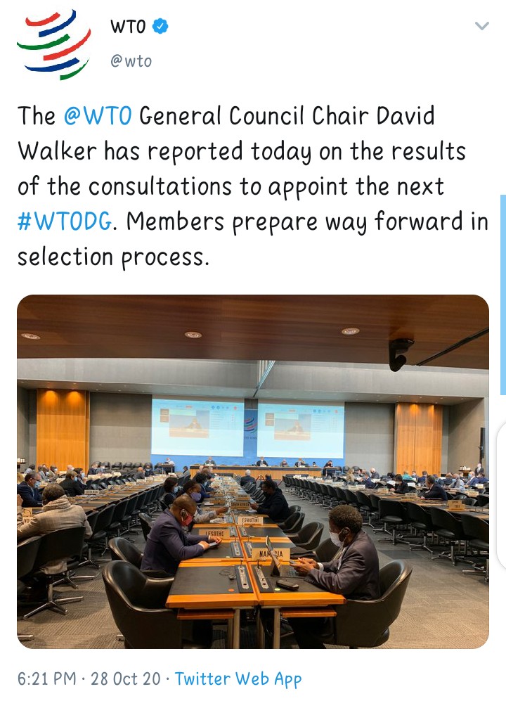 WTO members must formally decide in their General Council meeting who becomes the next director general. This meeting will happen on November 9. Before then, there will be consultations.