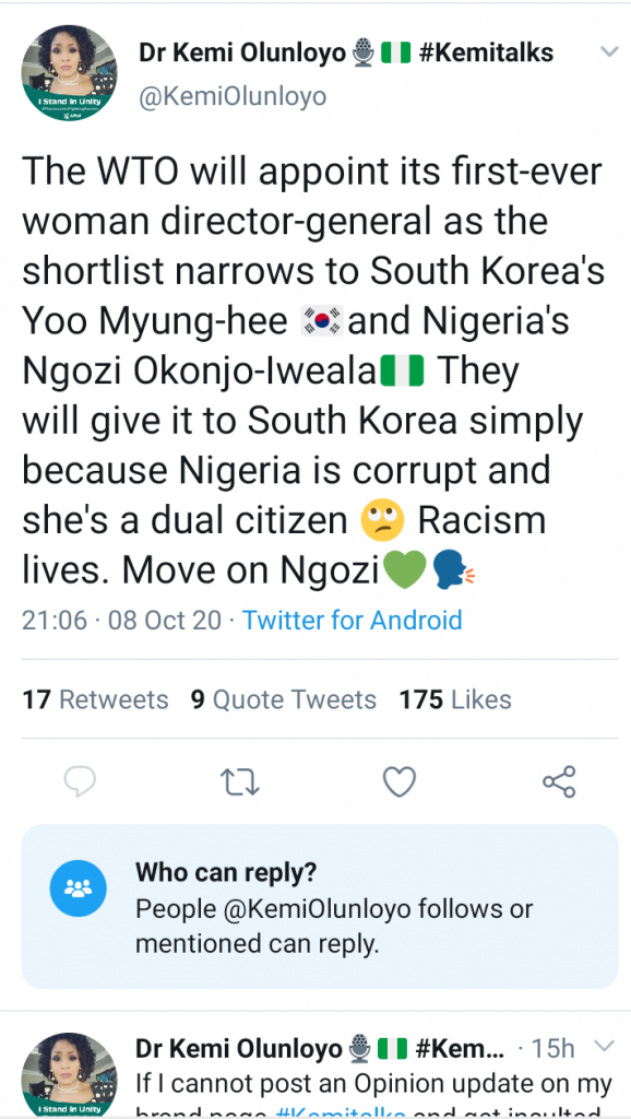 WTO: Okonjo-Iweala Will Not Win – Kemi Olunloyo Tells Ngozi To Move On - 9jaflaver