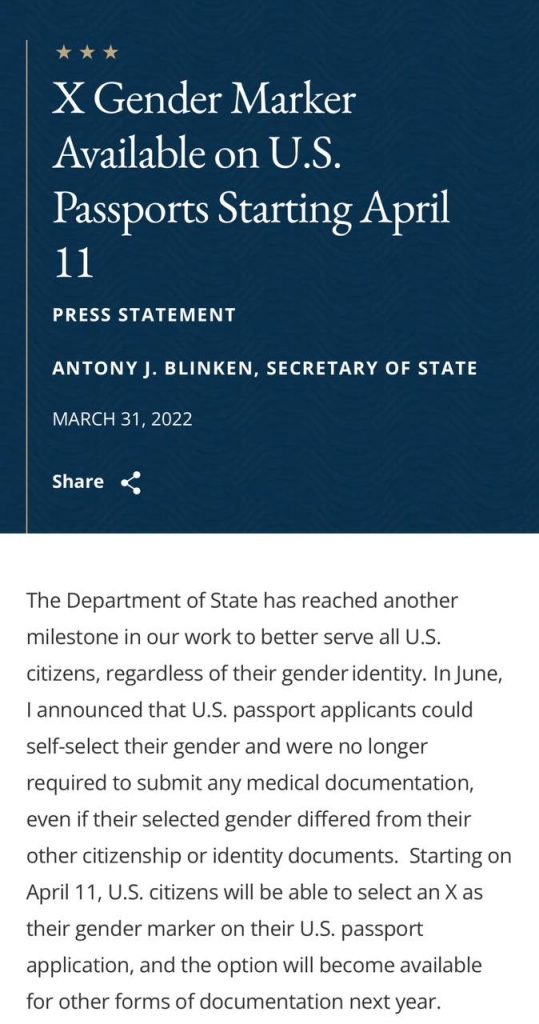 U.S. passports will include option for “X” gender marker starting April 11, 2022, State Department says