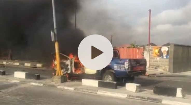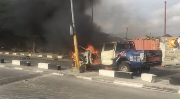 A police van has been burnt down by Nigerian protesters situation at Shoprite Mall, Osapa, Lekki.