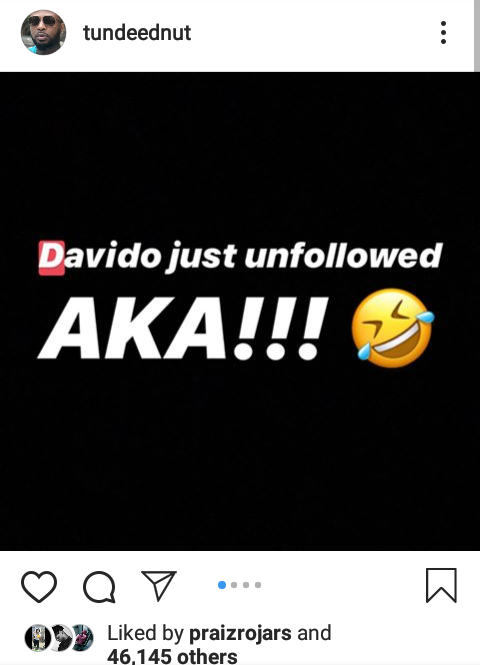 Davido has unfollowed south Africa’s rapper AKA on IG after he posted on Twitter that his disappointed in AKA.