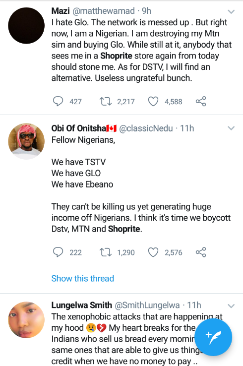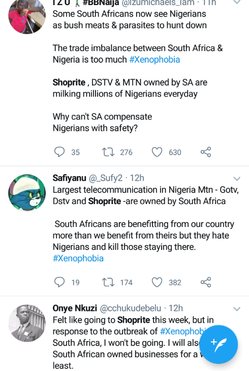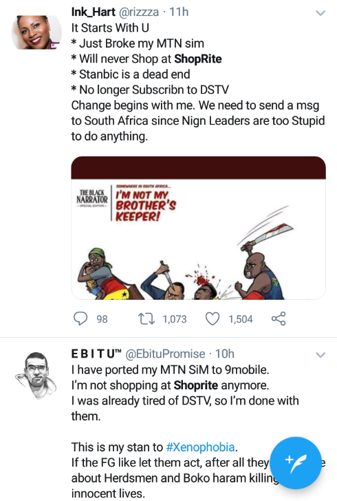 Angry Nigerians on Twitter in reaction to killing of their fellow countrymen in xenophobic attacks launched by South Africans have vowed to boycott MTN, Shoprite, Stanbic, DSTV and other businesses in Nigeria owned by South Africans.