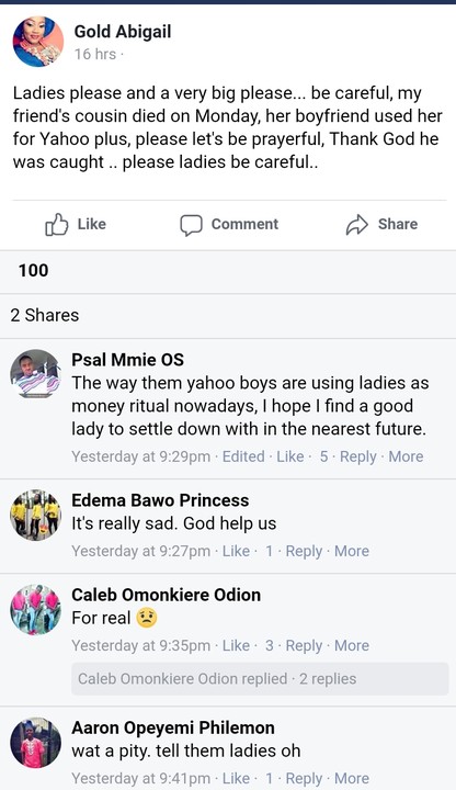 Ladies please and a very big please… be careful, my friend’s cousin died on Monday, her boyfriend used her for Yahoo plus, please let’s be prayerful, Thank God he was caught .. please ladies be careful..