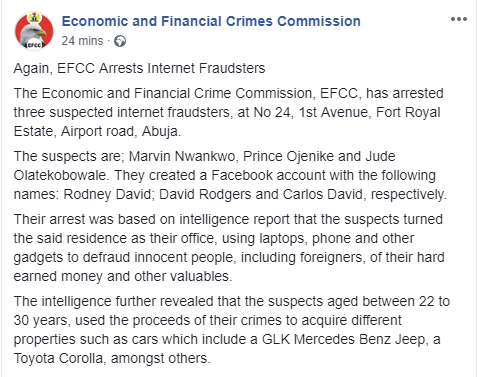 The suspects are; Marvin Nwankwo, Prince Ojenike and Jude Olatekobowale. They created a Facebook account with the following names: Rodney David; David Rodgers and Carlos David, respectively.