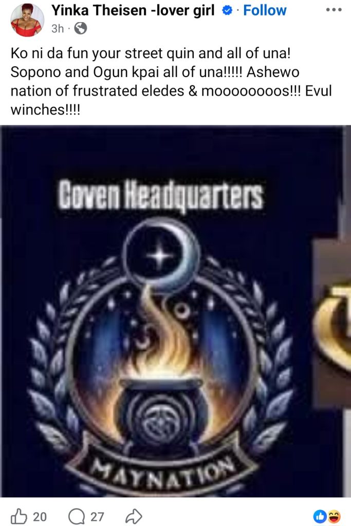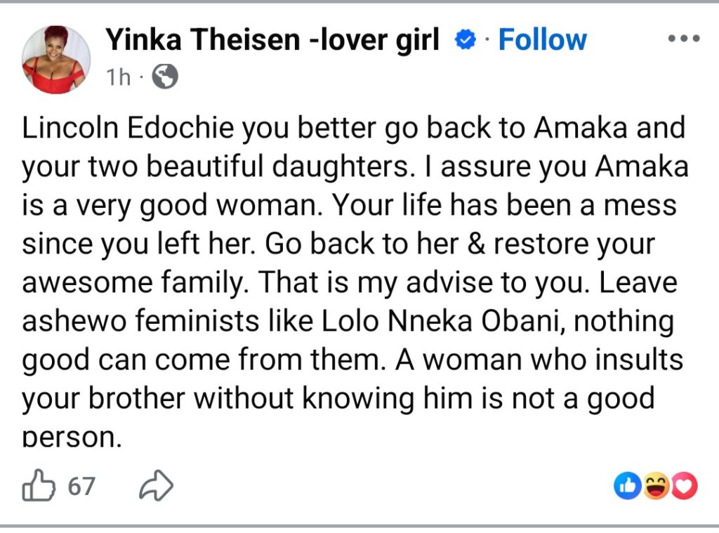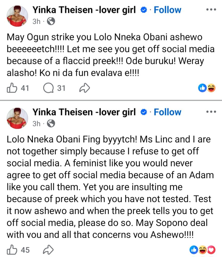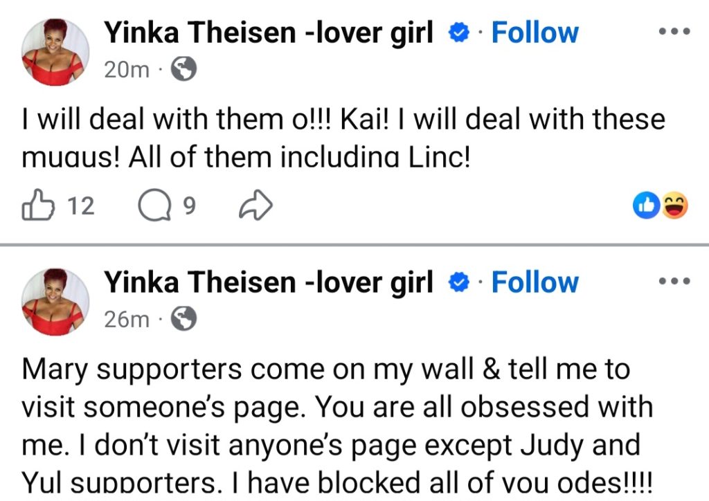 Yinka Theisen has gone on a posting spree, blasting her ex-fiance Linc Edochie, a woman alleged to have his attention, and also May Edochie.