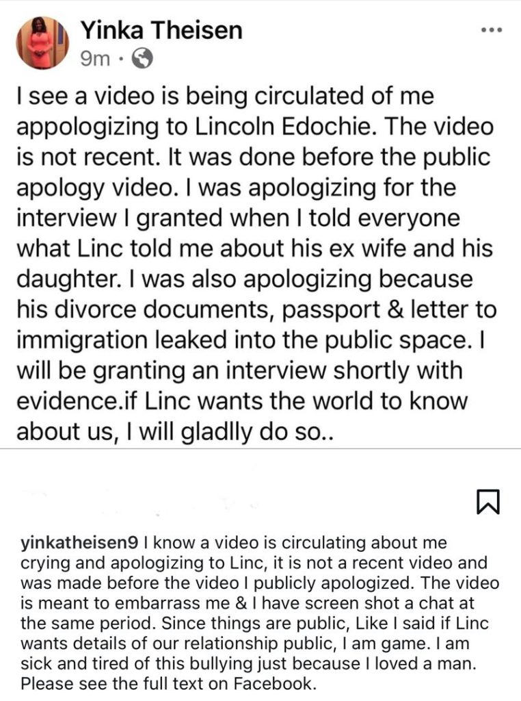 Yinka Theisen, the ex-girlfriend of Linc Edochie, has reacted after a video of her apologizing to him surfaced online.