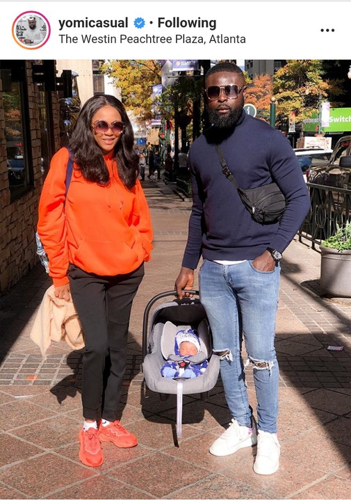 Yomi Casual and his wife, Grace were pictured posing together with their newborn son, Olorunyomi Kendrick Makun Jnr. as they stepped out today in Atlanta.