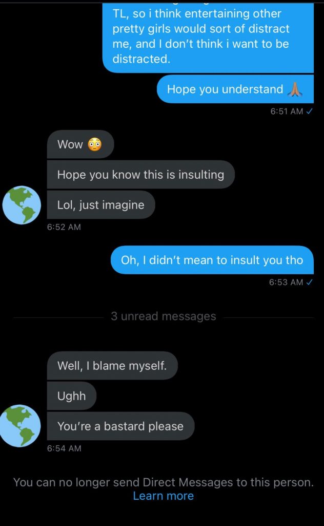 The man explained that he has a girlfriend and doesn’t want to entertain other pretty girl because he doesn’t want to be distracted. In response to the man’s message the lady said his explanation was insulting.