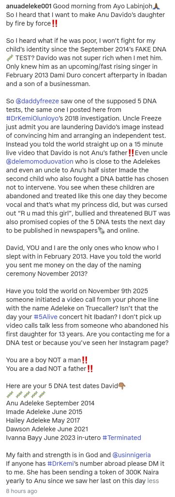“Even uncle Dele momoduovation who is close to the Adelekes and even an uncle to Anu’s half sister Imade the second child who also fought a DNA battle has chosen not to intervene. You see when these children are abandoned and treated like this one day they become vocal and that’s what my princess did, but was cursed out -R u mad this girl’, bullied and threatened BUT was also promised copies of the 5 DNA tests the next day to be published in newspapers and online.