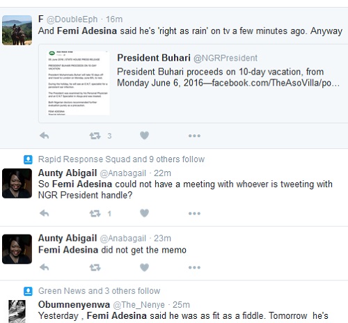 On Saturday, it was reported that the president was sick, and is being treated at the presidential villa, Abuja. But, Femi Adesina appeared from nowhere to release a statement discrediting news reports saying that the president is as fit as a fiddle.