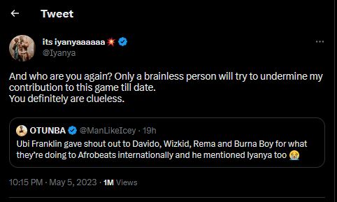 The Twitter user who didn’t agree with the opinion of Ubi Franklin that Iyanya has contributed to Afrobeat trashed the comment of Ubi Franklin.