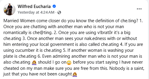 “Married Women come closer do you know the definition of cheating? 1. Once you are chatting with another man who is not your man romantically is cheating. 2. Once you are using v!brat0r it’s a big che.ating 3. Once another man sees your nak.edness with or without him entering your local government is also called che.ating 4. If you are using cucumber it is che.ating 5. If another woman is washing your plate is che.ating 6. Even admiring another man who is not your man is also che.ating. Should I go on before you start saying I have never cheated on my man make sure you are free from this. Nobody is a saint, just that you have not been caught,” she wrote in a Facebook post on Tuesday.
