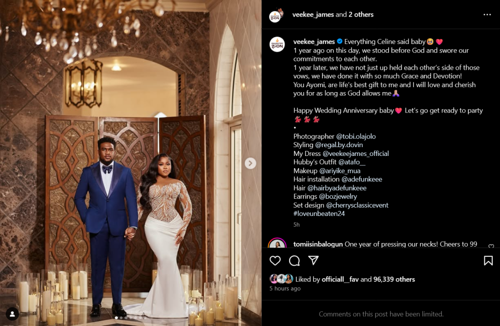 Nigerian fashion designer and entrepreneur, Veekee James, has penned a heartwarming message to her husband Femi Atere, in honour of their first wedding anniversary.