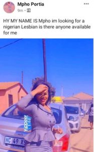 “Hi, my name is Mpho. I am looking for a Nigerian lesbian. Is there anyone available for me.” she wrote.