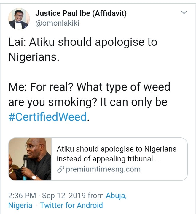 For asking Atiku Abubakar, the presidential candidate of the Peoples Democratic Party (PDP), to apologize to Nigerians rather than appeal his loss at the election tribunal, Lai Mohammed, Information Minister, has been told that he’s smoking weed.