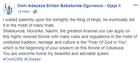 I waited patiently upon the Almighty the King of kings, he eventually did it in the midst of many trials. Shilekunola, Moronke, Naomi; the greatest Arsenal you can apply on this highly revered throne with many rules and regulations in the midst of undiluted tradition, heritage and culture is the “Fear Of God In You”, which is the beginning of your wisdom on this throne of Oduduwa. You are welcome home my beautiful and adorable queen. #OoniOfIfe #Otisese