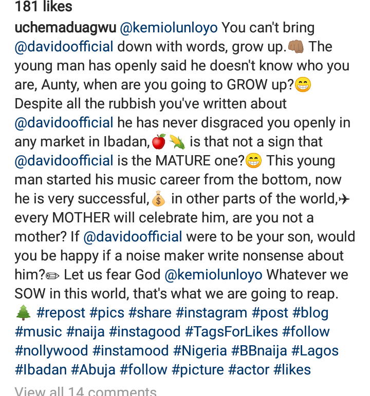 He shared a post blasting the controversial blogger Kemi Olunloyo for wanting to bring davido down with her words.