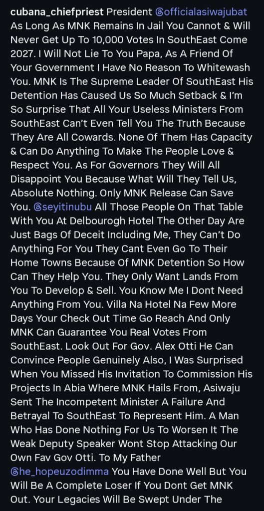Cubana Chief Priest issues a stark warning to President Bola Tinubu, insisting that the administration risks losing significant electoral support in the South-East if Nnamdi Kanu remains in detention ahead of the 2027 general elections.