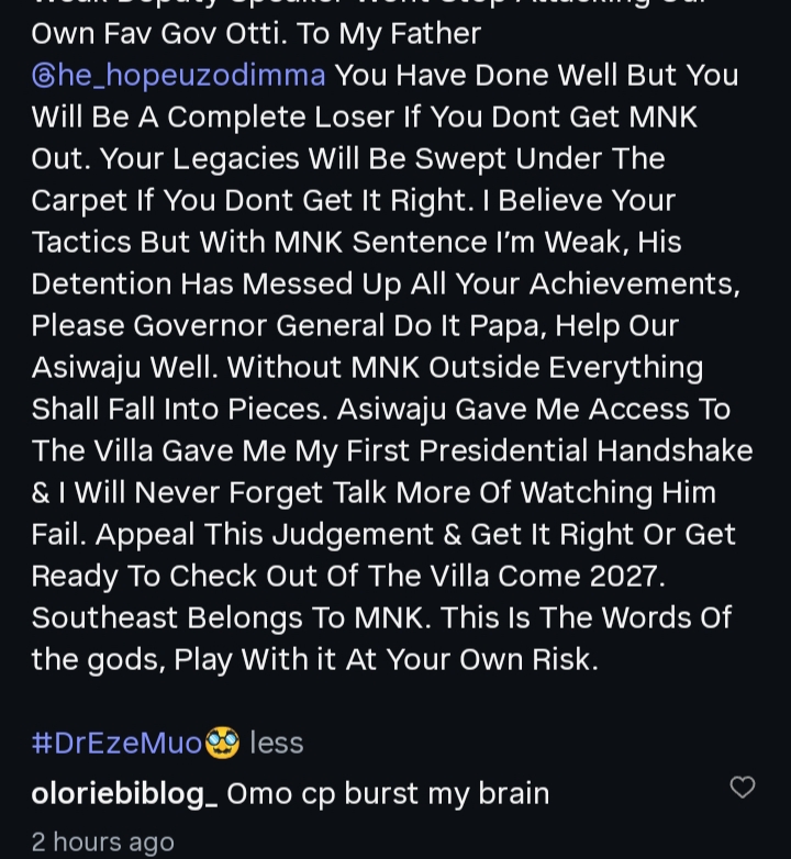 “President @officialasiwajubat As Long As MNK Remains In Jail You Cannot & Will Never Get Up To 10,000 Votes In SouthEast Come 2027. I Will Not Lie To You Papa, As A Friend Of Your Government I Have No Reason To Whitewash You. MNK Is The Supreme Leader Of SouthEast His Detention Has Caused Us So Much Setback & I’m So Surprise That All Your Useless Ministers From SouthEast Can’t Even Tell You The Truth Because They Are All Cowards. None Of Them Has Capacity & Can Do Anything To Make The People Love & Respect You. As For Governors They Will All Disappoint You Because What Will They Tell Us, Absolute Nothing. Only MNK Release Can Save You. @seyitinubu All Those People On That Table With You At Delbourogh Hotel The Other Day Are Just Bags Of Deceit Including Me, They Can’t Do Anything For You They Cant Even Go To Their Home Towns Because Of MNK Detention So How Can They Help You. They Only Want Lands From You To Develop & Sell. You Know Me I Dont Need Anything From You. Villa Na Hotel Na Few More Days Your Check Out Time Go Reach And Only MNK Can Guarantee You Real Votes From SouthEast. Look Out For Gov. Alex Otti He Can Convince People Genuinely Also, I Was Surprised When You Missed His Invitation To Commission His Projects In Abia Where MNK Hails From, Asiwaju Sent The Incompetent Minister A Failure And Betrayal To SouthEast To Represent Him. A Man Who Has Done Nothing For Us To Worsen It The Weak Deputy Speaker Wont Stop Attacking Our Own Fav Gov Otti. To My Father @he_hopeuzodimma You Have Done Well But You Will Be A Complete Loser If You Dont Get MNK Out. Your Legacies Will Be Swept Under The Carpet If You Dont Get It Right. I Believe Your Tactics But With MNK Sentence I’m Weak, His Detention Has Messed Up All Your Achievements, Please Governor General Do It Papa, Help Our Asiwaju Well. Without MNK Outside Everything Shall Fall Into Pieces. Asiwaju Gave Me Access To The Villa Gave Me My First Presidential Handshake & I Will Never Forget Talk More Of Watching Him Fail. Appeal This Judgement & Get It Right Or Get Ready To Check Out Of The Villa Come 2027. Southeast Belongs To MNK. This Is The Words Of the gods, Play With it At Your Own Risk.
