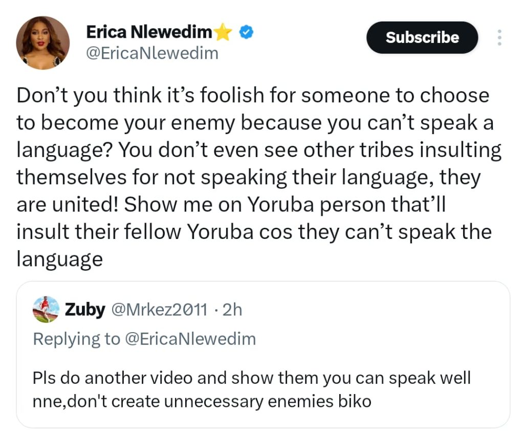 In a follow-up tweet, Erica questioned the quickness with which some Igbos are ready to shame their own, especially over something as personal as language fluency.