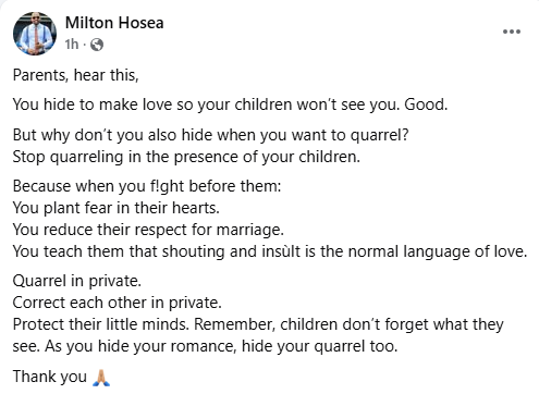 “Parents, hear this. You hide to make love so your children won’t see you. Good. But why don’t you also hide when you want to quarrel? Stop quarreling in the presence of your children,” he wrote in a Facebook post on Wednesday.