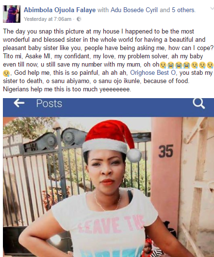 “The day you snap this picture at my house I happened to be the most wonderful and blessed sister in the whole world for having a beautiful and pleasant baby sister like you, people have being asking me, how can I cope? Tito mi, Asake MI, my confidant, my love, my problem solver, ah my baby even till now, u still save my number with my mum, oh oh, God help me, this is so painful, ah ah ah, Orighose Best O, you stab my sister to death, o sanu abiyamo, o sanu ojo ikunle, because of food. Nigerians help me this is too much yeeeeeeee.”