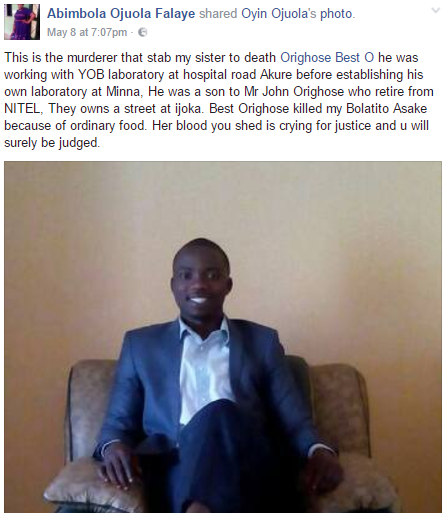 “This is the murderer that stab my sister to death Orighose Best O he was working with YOB laboratory at hospital road Akure before establishing his own laboratory at Minna, He was a son to Mr John Orighose who retire from NITEL, They owns a street at ijoka. Best Orighose killed my Bolatito Asake because of ordinary food. Her blood you shed is crying for justice and u will surely be judged,” Bolatito wrote on May 8th.