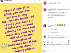 According to her, this shouldn’t be because choosing a partner goes beyond the physical and ladies need to activate their spiritual antenna when looking for a spouse.