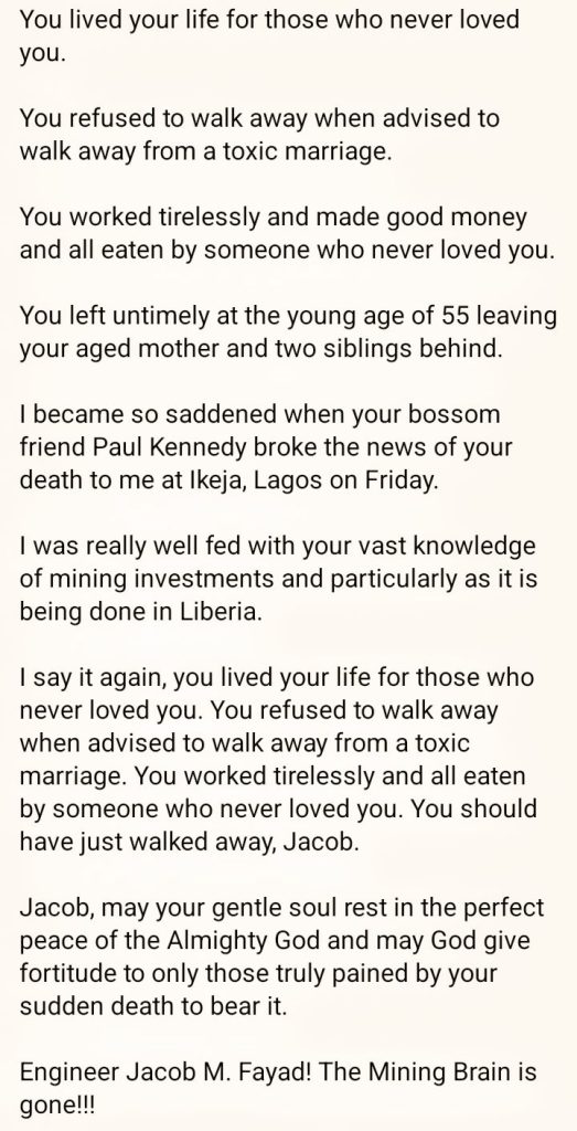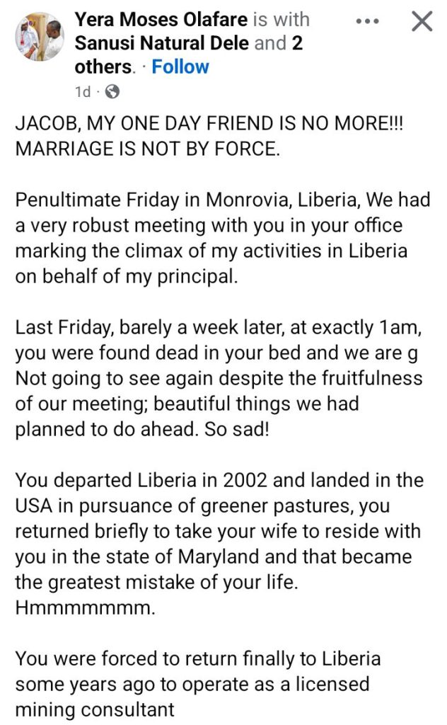 A Nigerian man, Yera Moses Olafare, has mourned a Liberian friend, Jacob Fayad, who died recently.