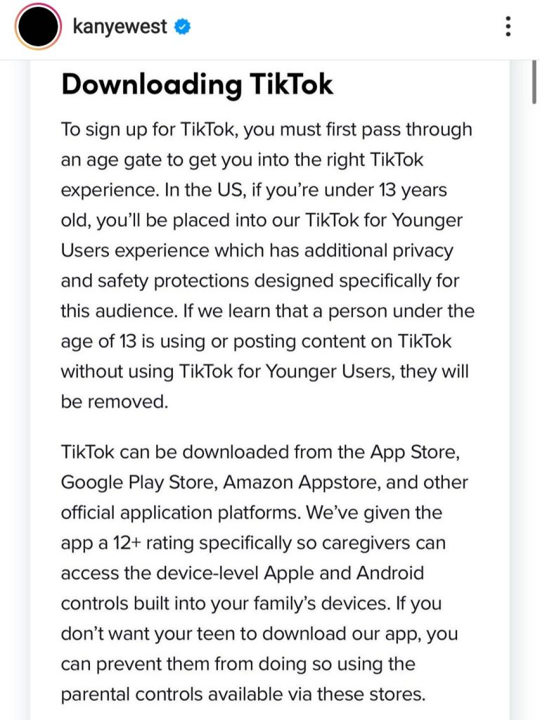 In another post, he shared a TikTok guideline stating that anyone under 13 shouldn’t use the regular TikTok, instead should be placed into the TikTok for younger users experience. North is 8 years old.