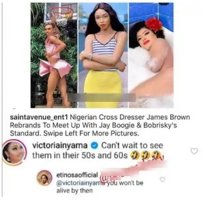 Etinosa replied the actress that she won’t live to witness Bobrisky, James Brown and Jay Boogie’s old age.