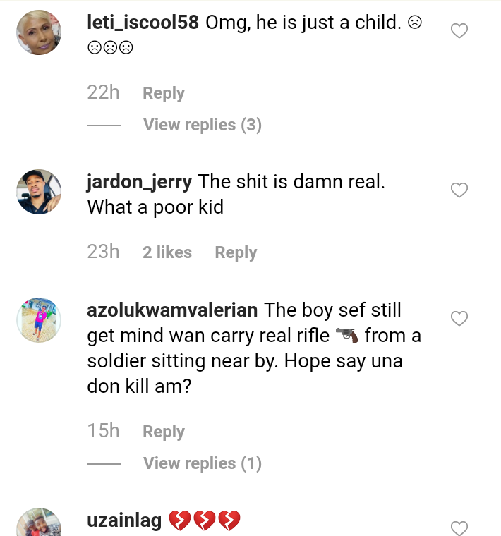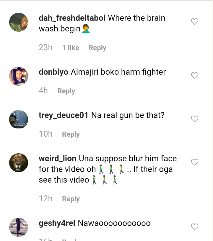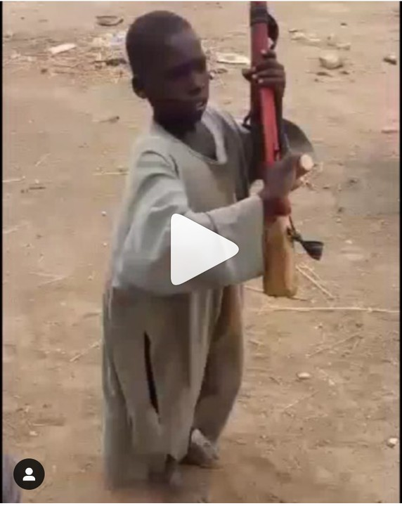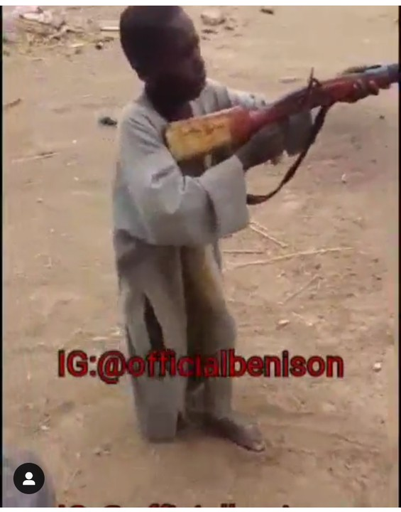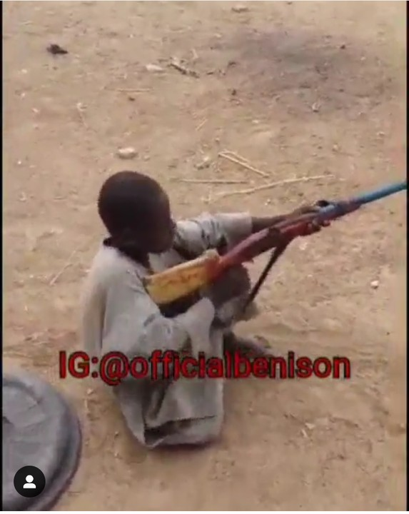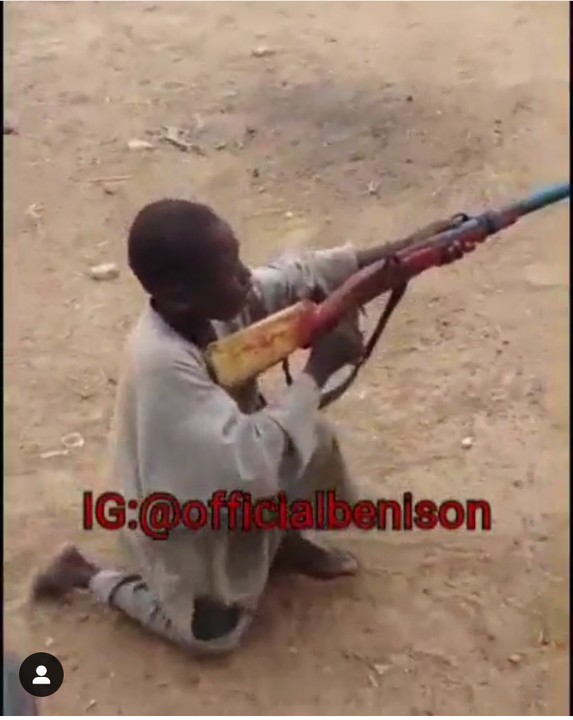 A young bokoharam member that was captured is demonstrating how he has been taught to handle weapons and engage during battle.