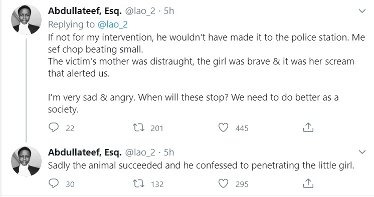 According to Abdullateef, a Legal Practitioner who shared the story on Twitter, the little girl’s scream alerted people around. The man confessed to penetrating the girl. Read the story below…