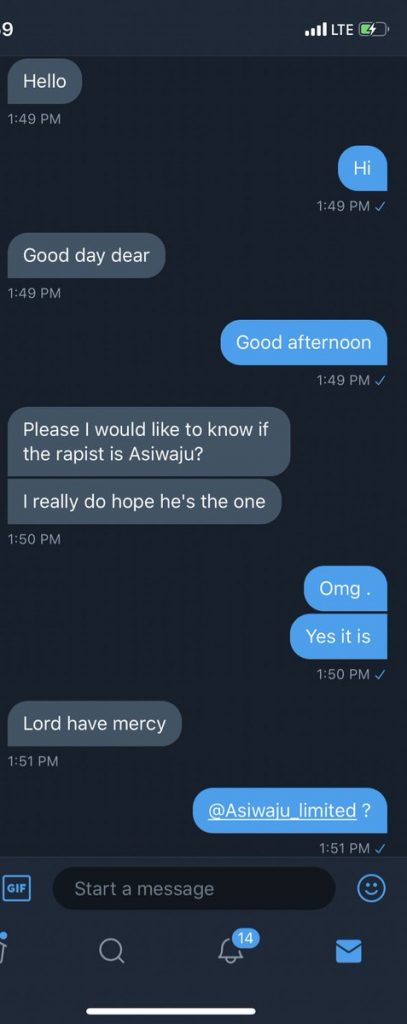 THE VICTIM LET THIS INCIDENT GO AT THE TIME BECAUSE SHE THOUGHT SHE’D NEVER RUN INTO HIM AGAIN AND IT WAS SOMETHING SHE WANTED TO PUT BEHIND HER. SHE JOINED TWITTER RECENTLY AND GUESS WHO SENDS HER A DM? THE SERIAL RAPIST. ACTING ALL BRAND NEW, HE DIDN’T EVEN REMEMBER HER.