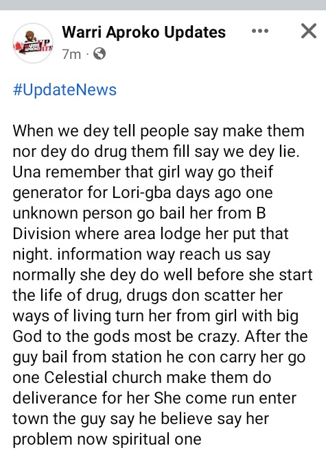 “Information way reach us say normally she dey do well before she start the life of drug. Drugs don scatter her ways of living turn her from girl with big God to the gods most be crazy. After the guy bail from station he con carry her go one Celestial church make them do deliverance for her. She come run enter town the guy say he believe say her problem now spiritual one. The guy say he don still contact OPM foundation for PH and they ready to help the girl but now the girl don run”