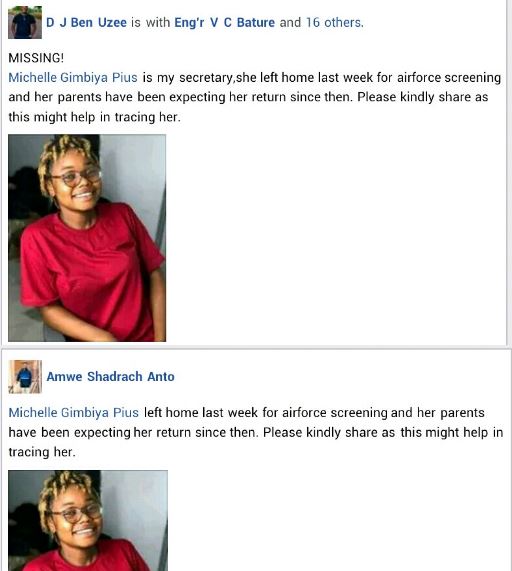 “MISSING! Michelle Gimbiya Pius is my secretary. She left home last week for airforce screening and her parents have been expecting her return since then. Please kindly share as this might help in tracing her.” he wrote on Monday, June 28.