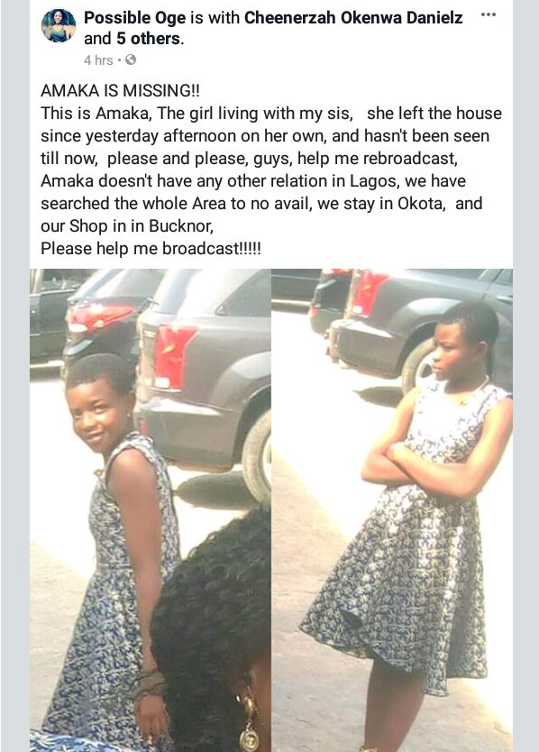 A young girl identified as Amaka has been declared missing by her guardians. According to Facebook user, Ms Oge, Amaka left her employer’s house in Okota on Saturday afternoon and hasn’t returned since then. Read below: “AMAKA IS MISSING!!This is Amaka, The girl living with my sis, she left the house since yesterday afternoon on her own, and hasn’t been seen till now, please and please, guys, help me rebroadcast, Amaka doesn’t have any other relation in Lagos, we have searched the whole Area to no avail, we stay in Okota, and our Shop in in Bucknor, Please help me broadcast!!!!!