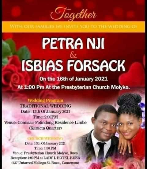 Their church wedding was scheduled to take place on Saturday the 16th of January at Presbyterian Church Molyko, Buea while the traditional wedding was slated for Friday, January 15.