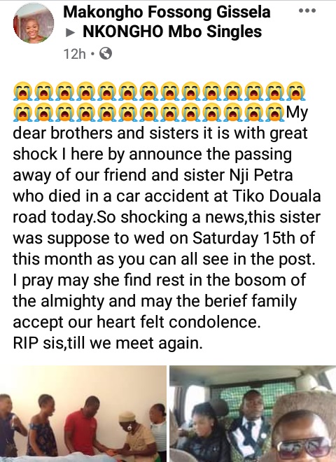 According to reports surrounding her demise, Petra and her husband-to-be, Isbias Forsack were returning from Douala after their pre-wedding shopping when they got involved in a motor accident along Tiko-Douala road on Monday, January 11, 2021. Isbias and other passengers sustained injuries and were rushed to a medical facility but unfortunately, Petra didn’t make it.