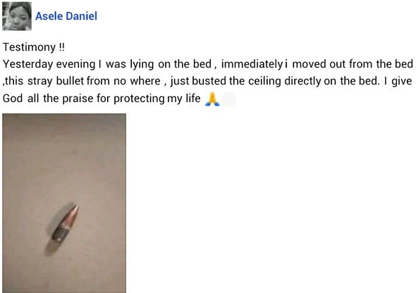 “Immediately I moved out from the bed, this stray bullet from nowhere just bust the ceiling and fell directly on the bed. I give God all the praise for protecting my life,” she said.